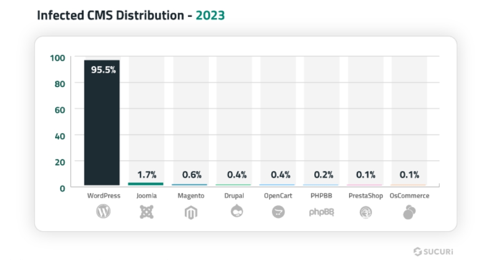 Conform SUCURi în anul 2023 din totalul de platforme infectate, WordPress era fruntașul clasamentului cu peste 95.5% .